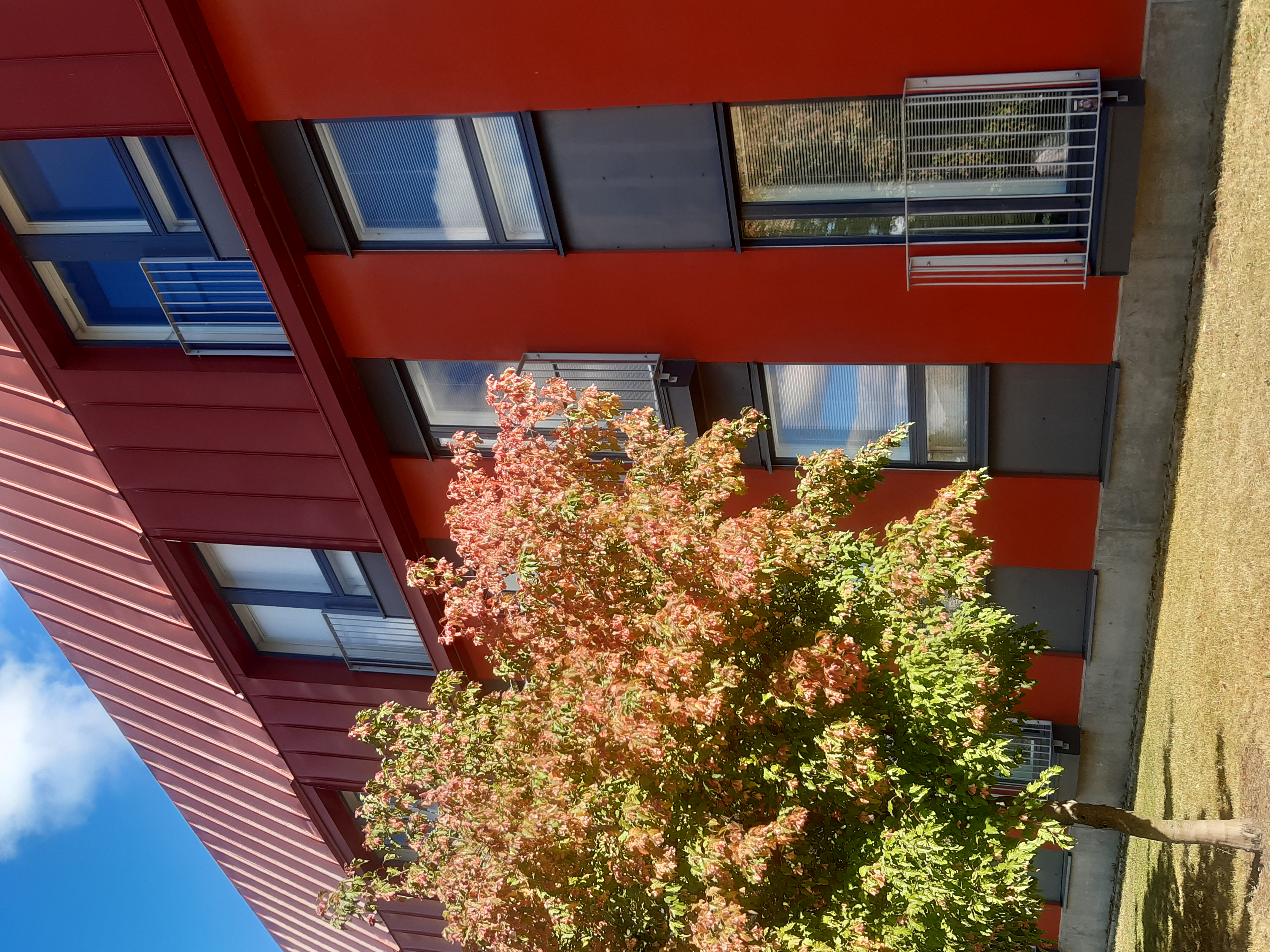 Helsingin Alppikylässä syksyinen puu näyttää kauniilta kirkkaanpunaista taloa vasten.